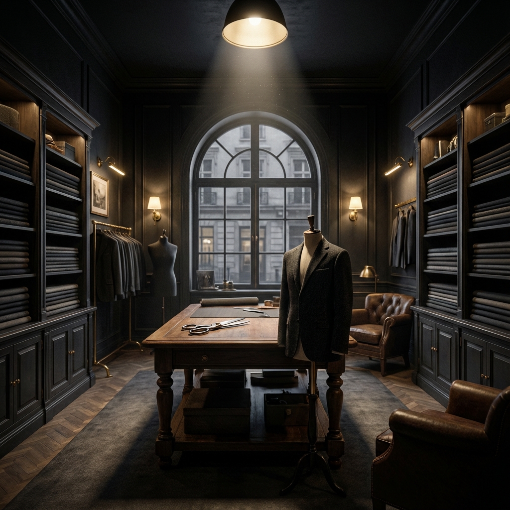 Master tailor stores at the center—human craftsmanship, hand-finished details, and clear standards.